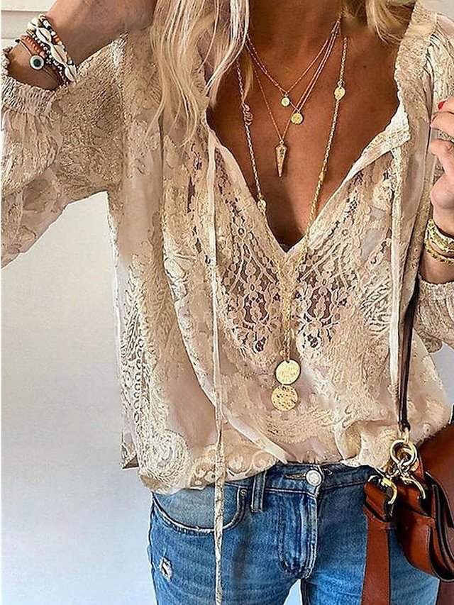 Boho Casual Solid V Neck Long Sleeve Regular Lace Patchwork Top