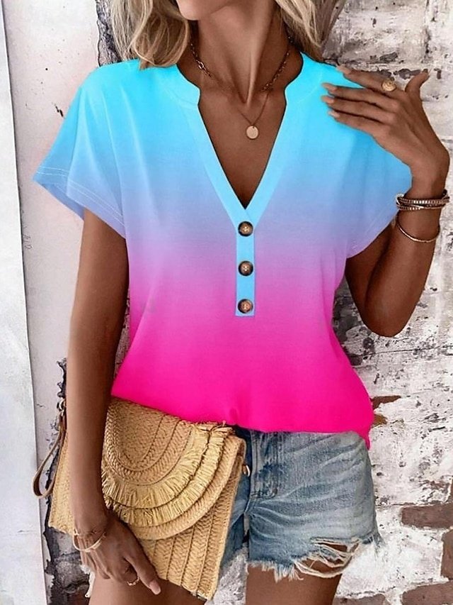 Discover our Casual Loose Gradient V-Neck Summer Top in Blue and Pink, perfect for effortless elegance. Shop now for style and comfort.