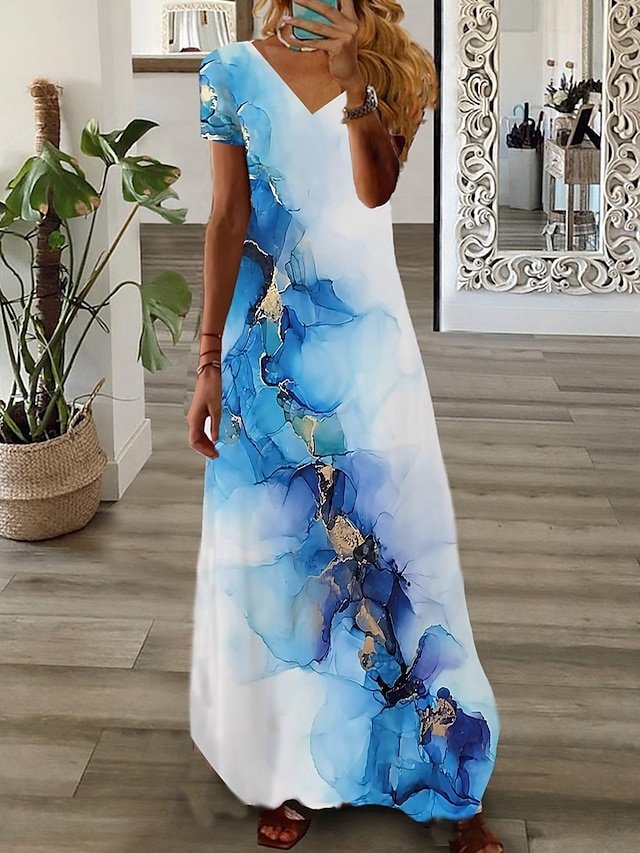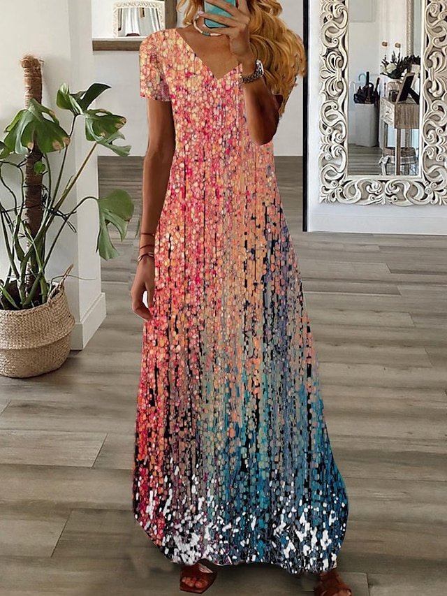 Step into a world of effortless elegance with our Casual Loose Graphic Print V Neck Maxi Dress. Perfect for both captivating holiday moments and everyday leisure, this dress is your ticket to a summer of style and comfort.