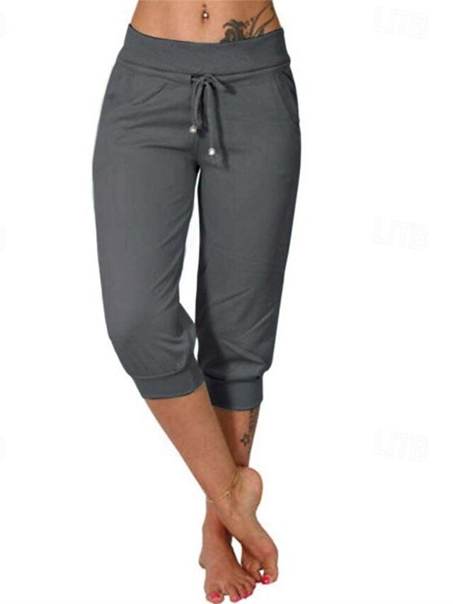 Casual Mid Waist Plain Elastic Waist Calf-Length Capri Pants