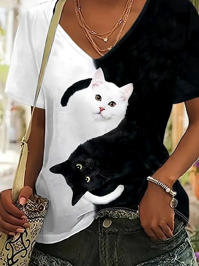 Discover our chic casual colour block top with cat print, featuring a V neck and short sleeves for a stylish summer look.