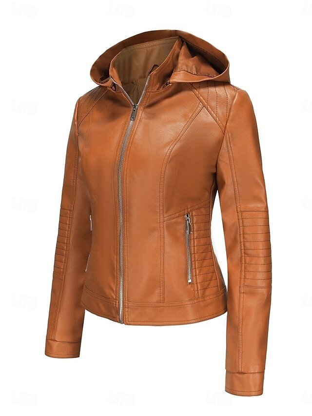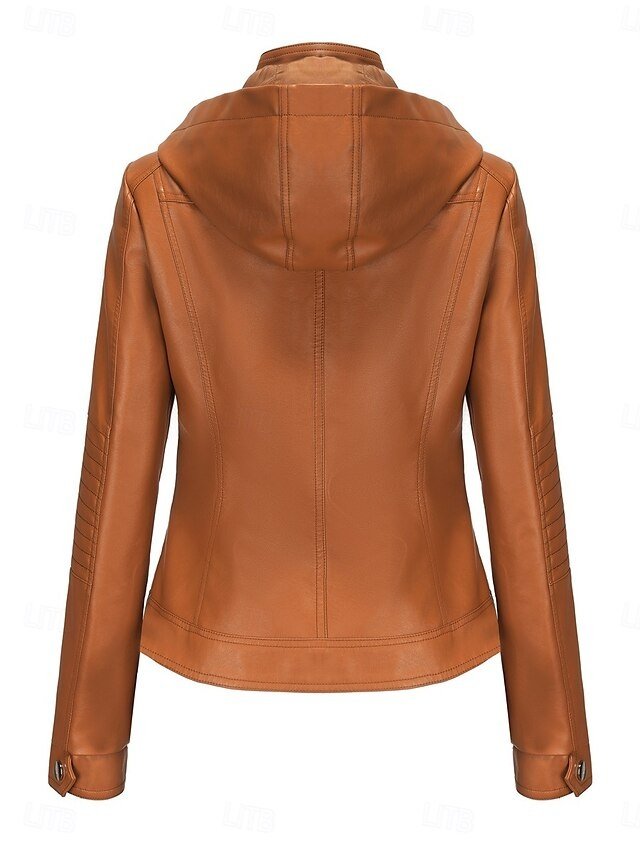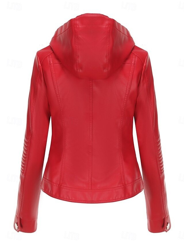 Discover our chic casual faux leather jacket with a hood, perfect for everyday elegance. Available in Red, Camel, and Coffee.