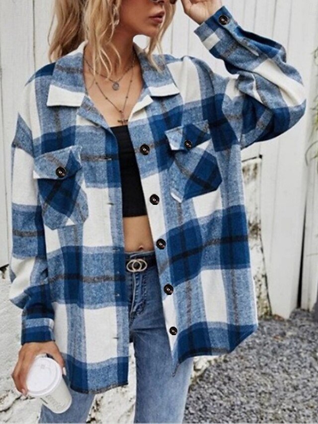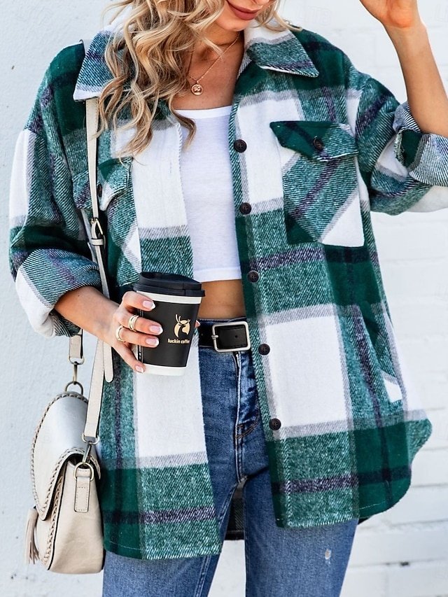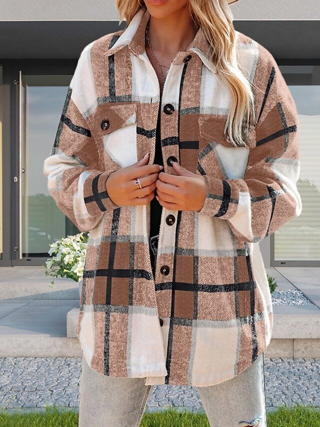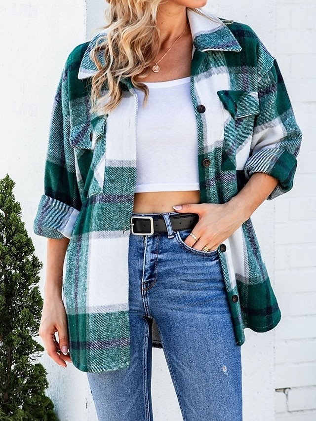 Elevate your outerwear collection with our chic and versatile Casual Regular Plaid Turndown Long Sleeve Shirt Jacket, designed for the fashion-forward woman who embraces both comfort and style. Perfect for vacation, street outings, or daily wear, this jacket seamlessly combines practicality with a touch of elegance.