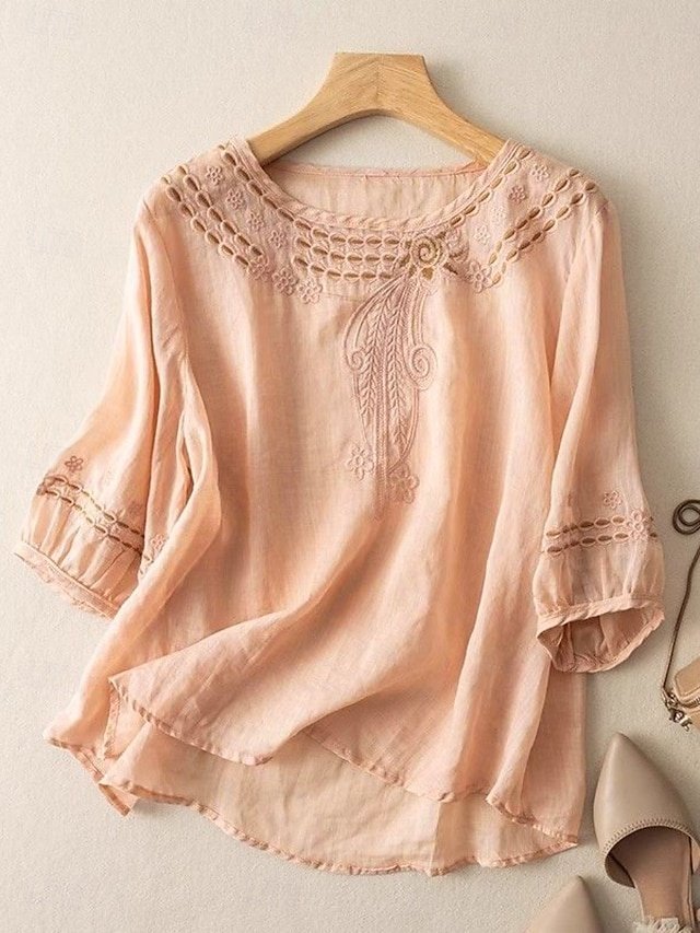Discover the elegant casual blouse with lace patchwork, crafted from premium cotton linen. Perfect for summer daily wear. Available in various sizes.