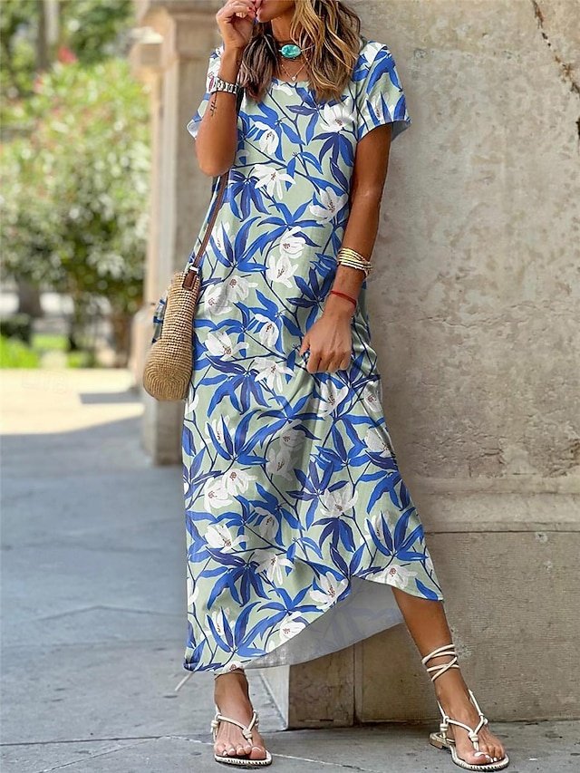 Discover our Casual Shift Floral Leaf Maxi Dress. Perfect for summer elegance with a crew neck and short sleeves. Ideal for vacations and dates.
