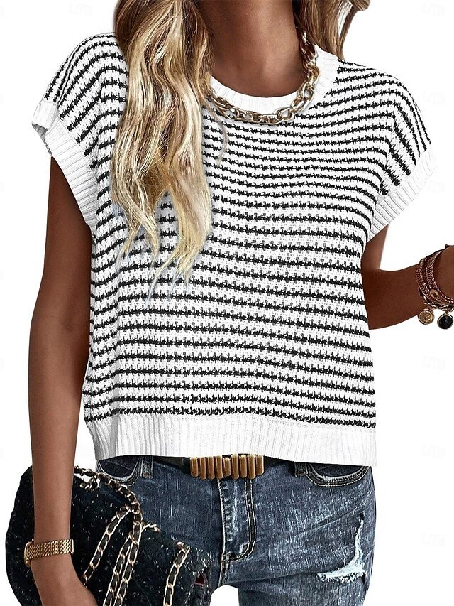 Step into a world of chic simplicity and undeniable charm with our Cute Regular Striped Crew Neck Batwing Short Sleeve Crop Top. Perfectly suited for those who cherish the art of casual sophistication, this exquisite piece effortlessly transitions from a relaxed home setting to a lively party atmosphere.