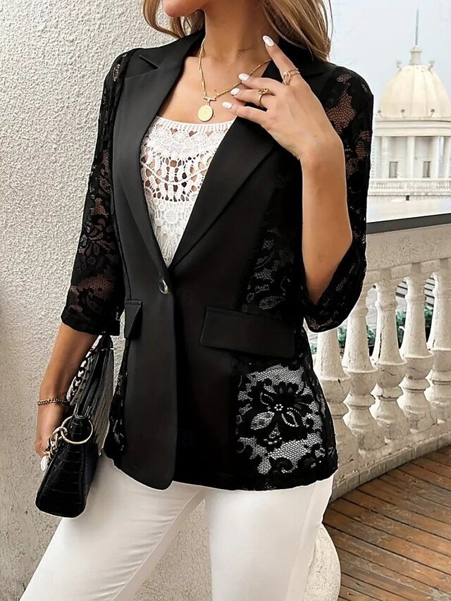 Discover elegance with our Lace Patchwork Blazer. Perfect for the modern woman, this black summer essential blends comfort with chic style.