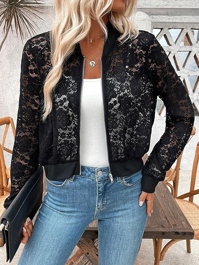 Elegant Regular Fit Lace Stand Collar Long Sleeve Short Bomber Jacket