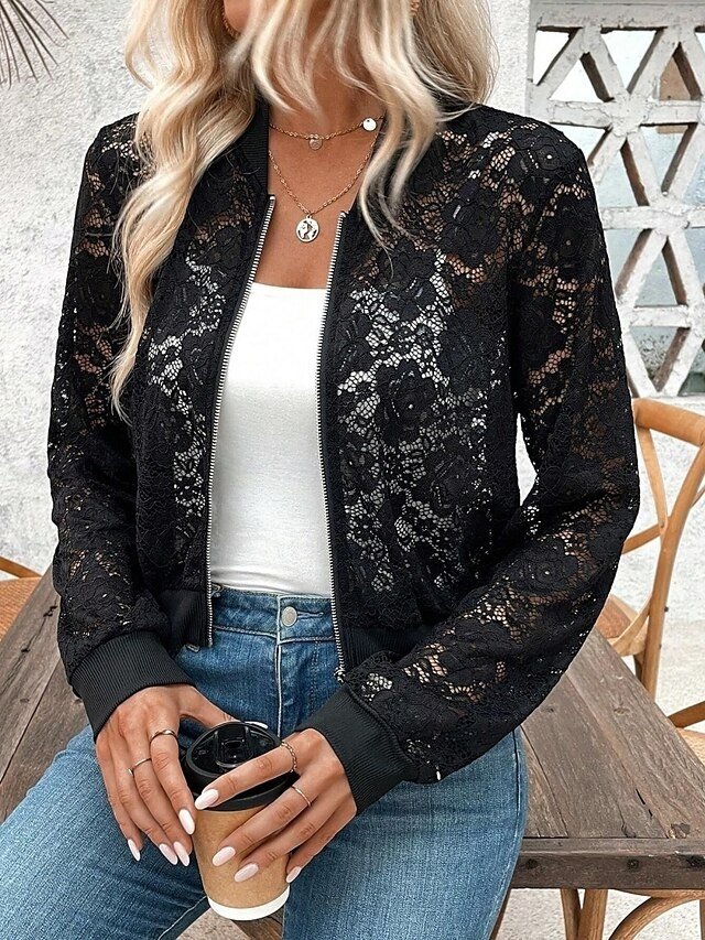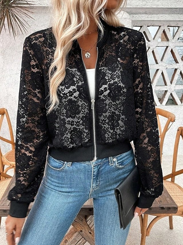 Discover elegance with our lace patchwork bomber jacket. Ideal for stylish casual and vacation wear. Perfect fit and timeless black.