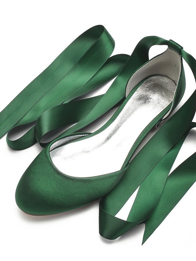 Discover elegant green satin flats with ribbon ties, perfect for weddings and occasions. Comfortable and chic for any special moment.