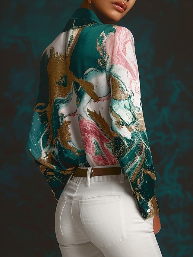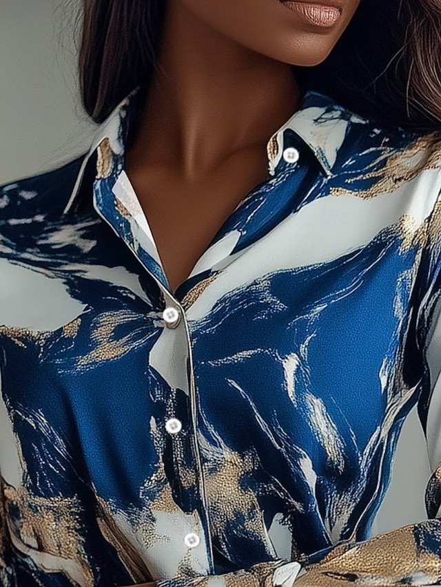 Elegant Stylish Marble Print Button Down Long Sleeve Blouse