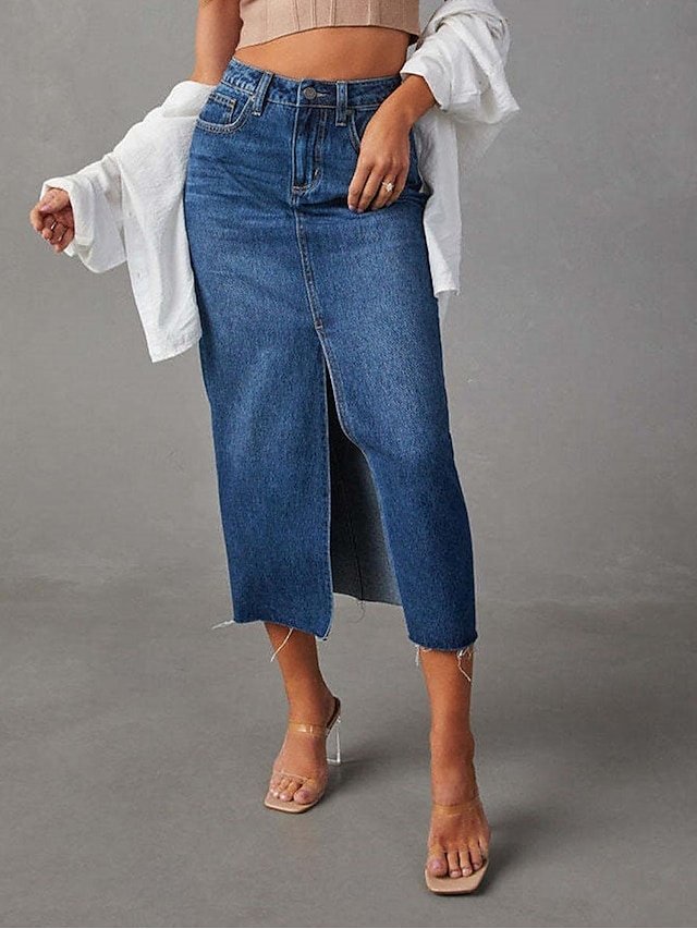 Discover timeless elegance with our Fashion A Line Solid High Waist Midi Denim Skirt, perfect for any occasion. Shop now for a chic summer style.