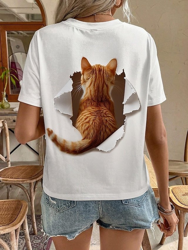 Fashion Regular Cat Print Round Neck Short Sleeve Top