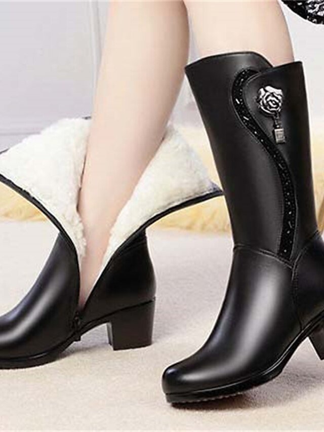 Stylish Mid-Calf Black Fur Chunky Heel Winter Boots