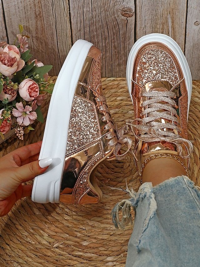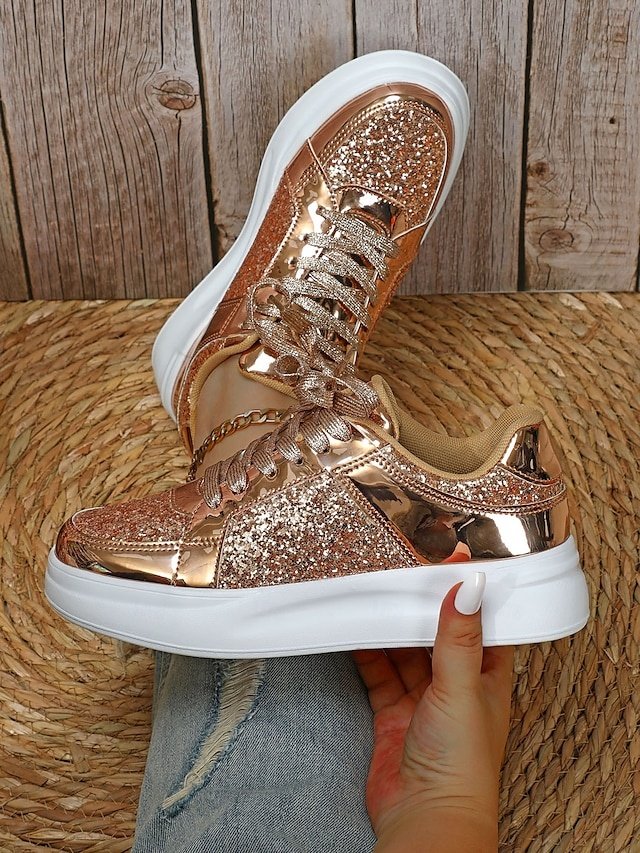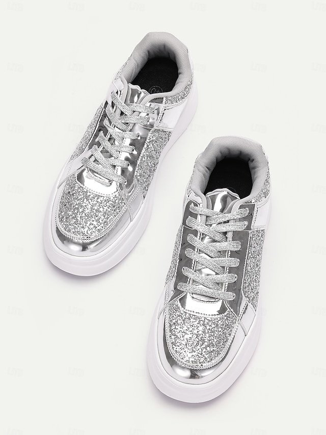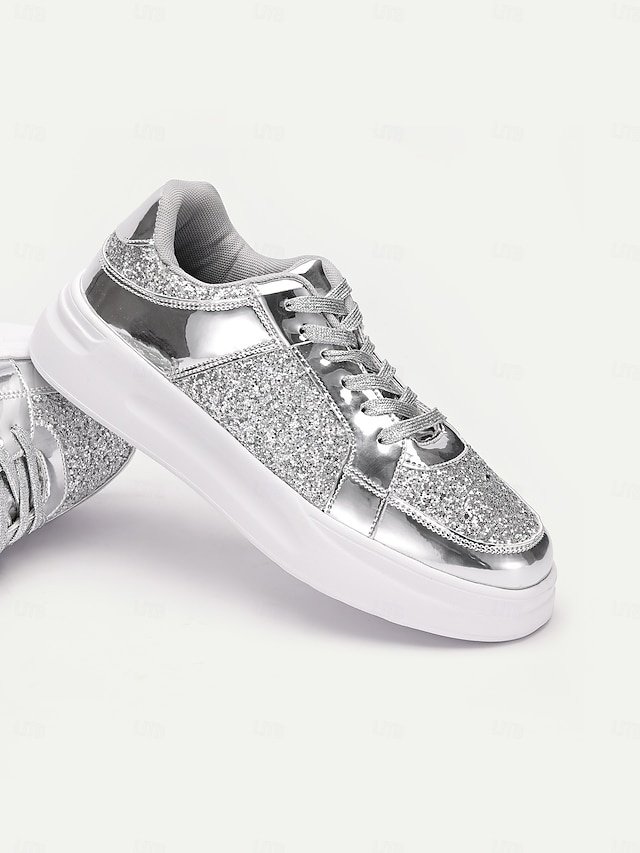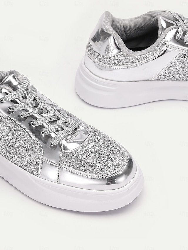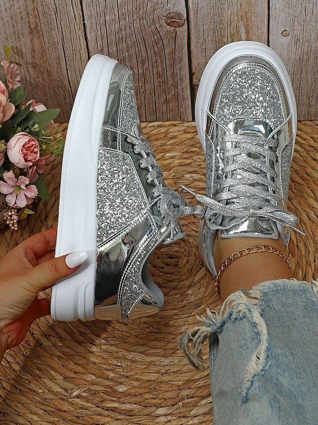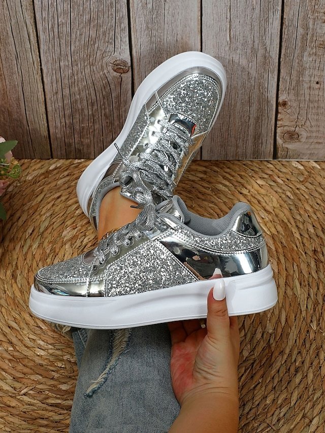 Step into the spotlight with our sensational Silver Glitter and Metallic Sneakers, the ultimate fusion of fashion-forward flair and everyday comfort. Crafted for the modern woman who seeks to dazzle at every occasion, these sneakers are your go-to choice for both parties and casual outings.