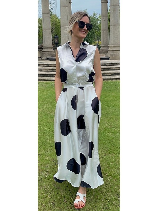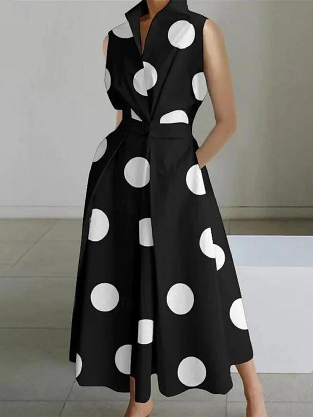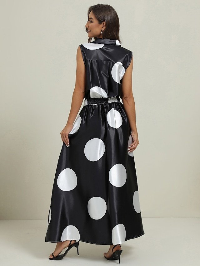 Vintage Regular Fit Polka Dot Shirt Collar Sleeveless Maxi Dress